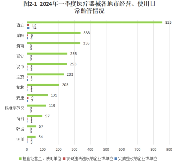 2024年一季度,全省检查医疗器械经营企业和使用单位2924家次,同比下降59.6%,环比下降59%,飞行检查3家次。存在违法违规的企业或单位36家次,占1.2%,完成整改的企业或单位35家次。