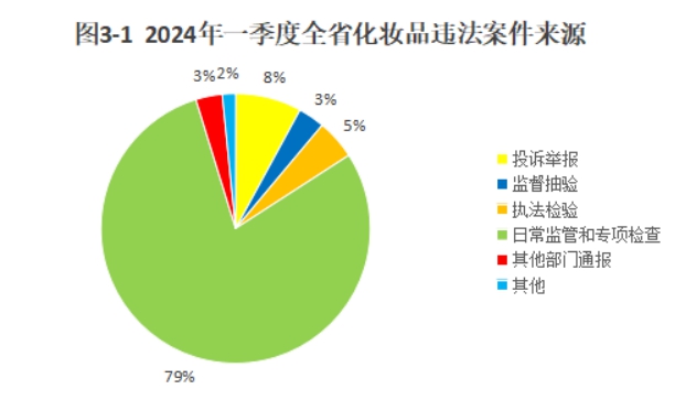 从案件来源看,来源于日常监管和专项检查的案件50件(占比79%)。从案件的违法主体看,来源于化妆品经营企业的案件62件(占比98%),来源于美容美发机构的案件19件(占经营企业案件总数的30.6%),来源于集中交易市场3件(占经营企业案件总数的4.8%)。