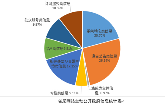切实做好信息公开工作, 拓展信息发布渠道,加大主动公开力度,将省局网站打造成为信息公开的“第一平台”,完善栏目建设,提高信息发布质量和效率,为公众提供及时、准确、权威信息。 2017年1月1日至12月31日,省局网站共计主动公开政府信息2367条。其中:食品药品监管系统动态类信息490条,占20.70%;通告公告类信息620条,占26.19 %;法规类文件信息23条,占0.97%;专栏类信息121条,占5.11%;相关处室及直属单位类信息406条,占17.15 %;综合类信息225条,占9.51%;公众服务类信息236条,占9.97%;许可服务类信息246条,占10.39%。