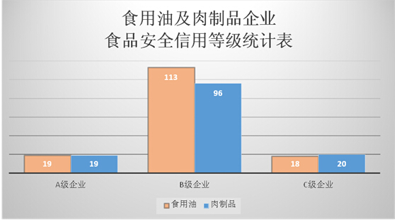 肉制品及工业加工食品监管处根据国家总局的工作要求进行了食用油及肉制品企业进行食品安全信用等级评定,其中,食用油A级企业19家、B级113家、C级18家;肉制品A级企业19家、B级96家、C级20家,并及时在网站上将评定结果予以公布。
