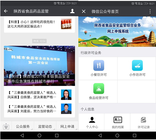 我局建设了陕西省食品药品监督管理局微信公众号,及时公开监管工作动态、监管信息。也建设了微信服务号,监管对象可以通过微信服务号进行业务申报,方便快捷开展材料报送。